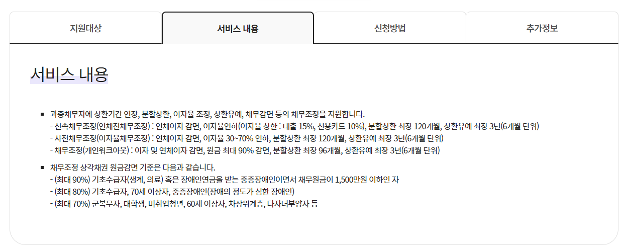 - 과중채무자에 상환기간 연장, 분할상환, 이자율조정, 상환유예, 채무감면 등의 채무조정지원