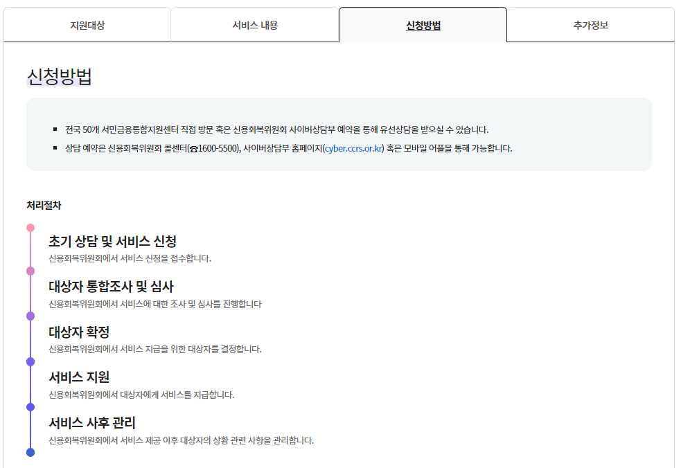 - 콜센터(1600-5500) 혹은 사이버 상담부 홈페이지(https://cyber.ccrs.or.kr)에서 서비스 신청 접수 : 개인은 지정된 상담 기관에 연락하여 상담사와 약속을 잡을 수 있습니다. 상담 기관은 개인의 재정 상황을 검토하고 부채 조정 프로그램에 적합한지 여부를 결정합니다.